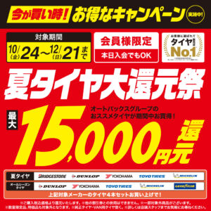 夏タイヤ大還元祭【10/24~12/21】 オートバックス会員限定、夏タイヤ大還元祭を10月24日(金)~12月21日(日)まで実施いたします。 オートバックス会員様[入会金・年会費無料/当日入会可] 対象の夏タイヤ4本セ...