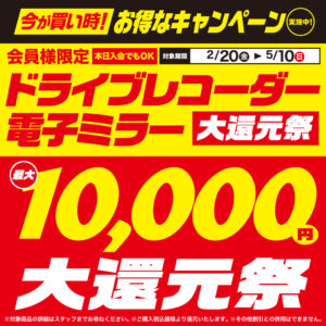 ドラレコ最大1万円大還元祭【2/20~5/10】 オートバックス会員限定、ドライブレコーダー大還元祭を2026年2月20日(金)~2026年5月10日(日)まで実施いたします。 オートバックス会員様[入会金・年会費無料/当日入会可...